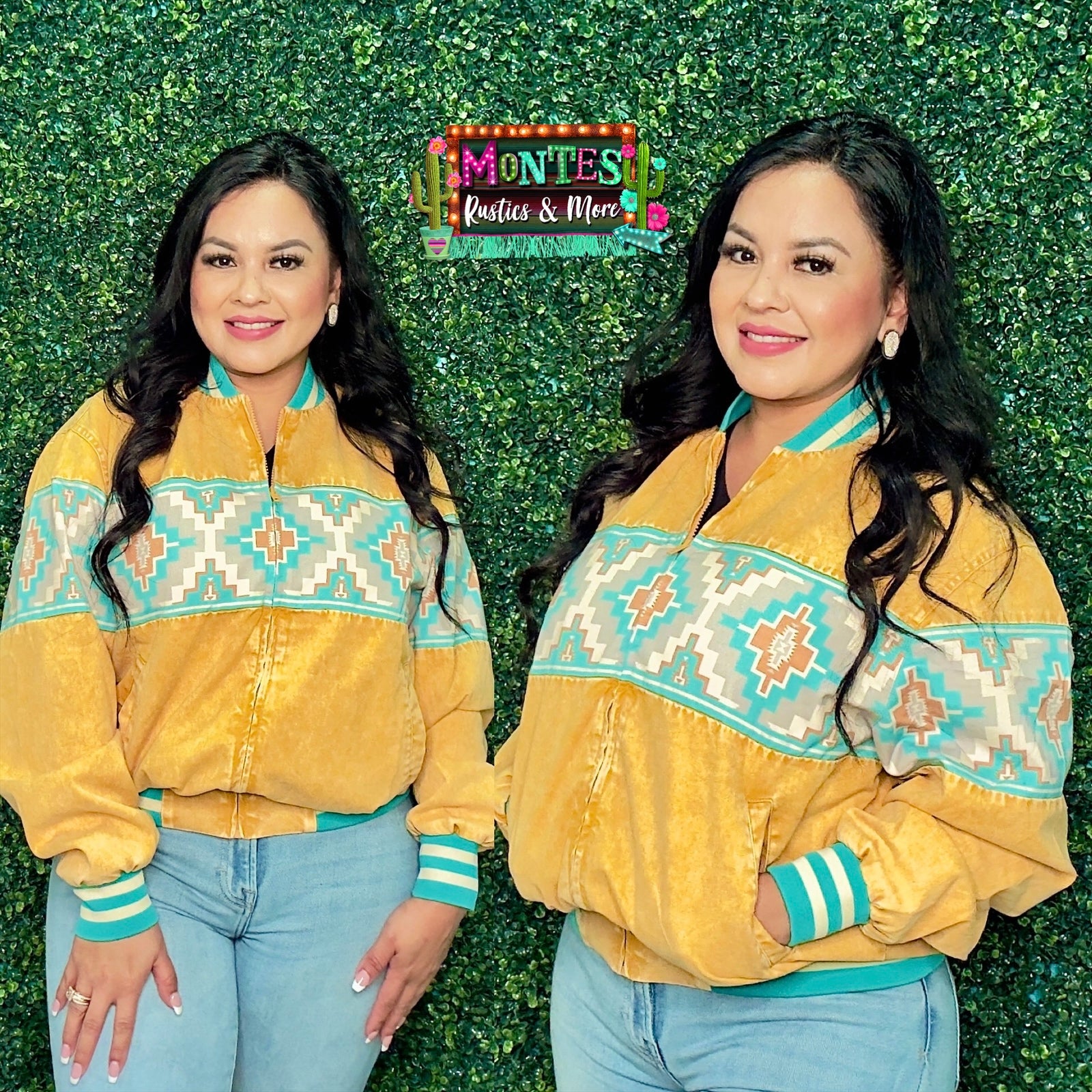 Step back into the 90’s with this fresh mustard bomber jacket that brings just the right burst of turquoise to brighten your look. Its bold color combo adds a playful twist to any outfit, making it a standout piece for your casual adventures or retro-inspired days. Perfect for those who love a little nostalgia mixed with vibrant style.