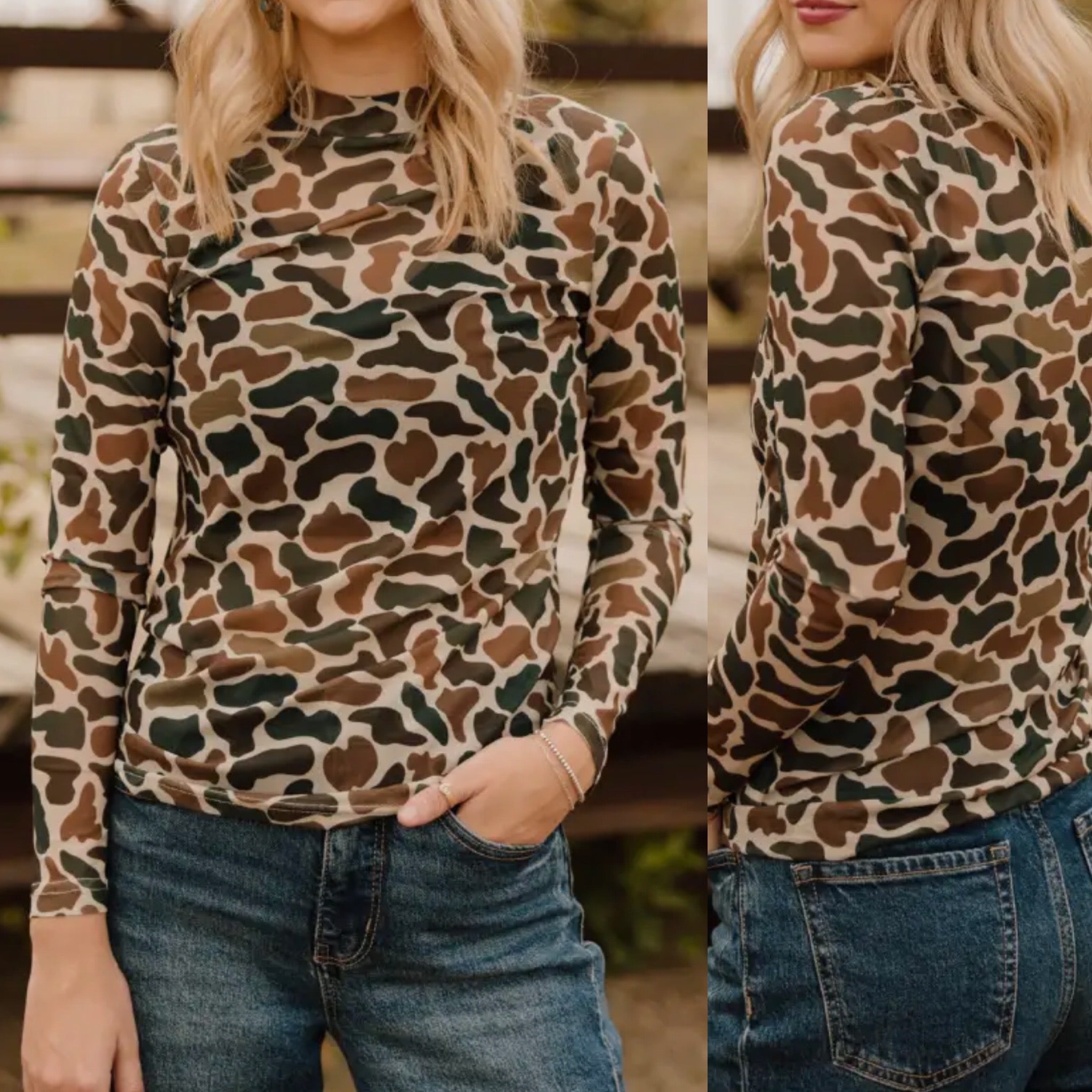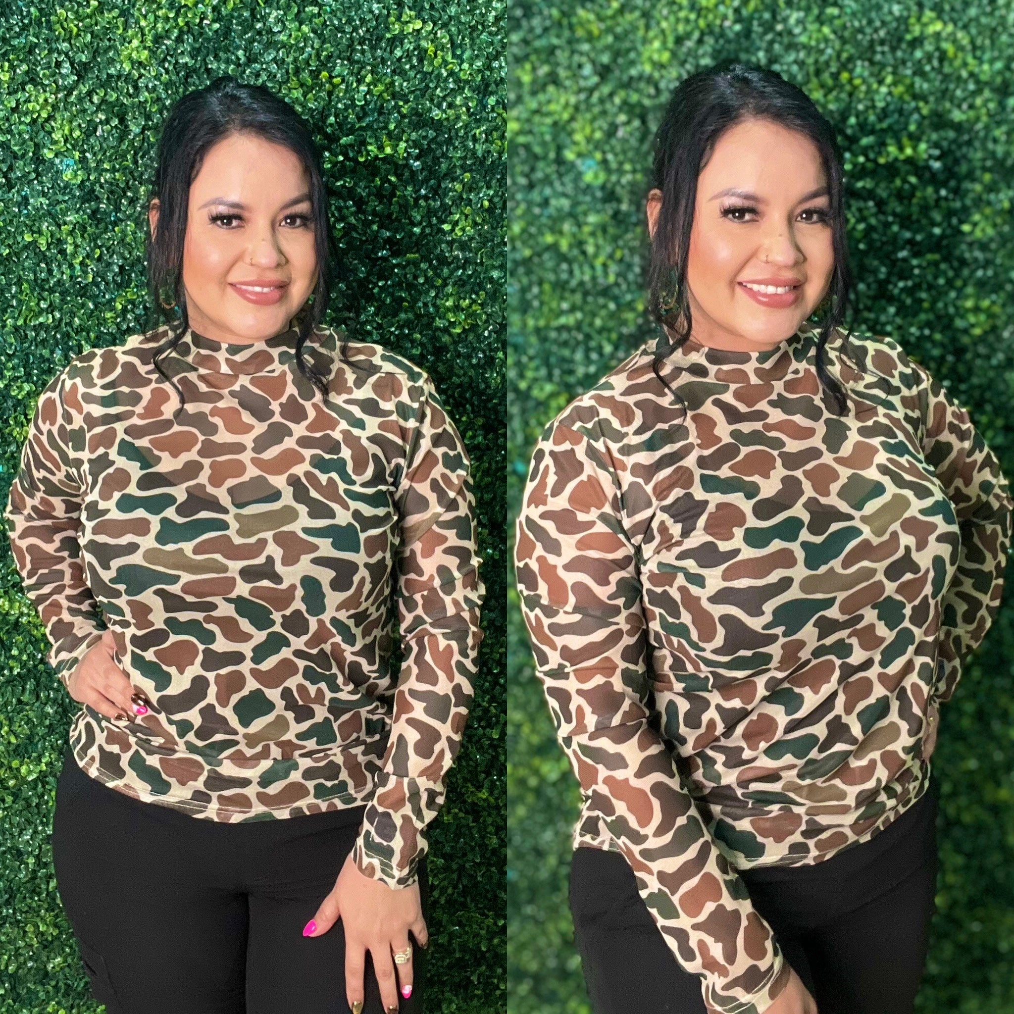 Unleash your daring side with the You Can't See Me Mesh Top! Featuring a trendy camo print and breathable mesh fabric, this top adds edge and style to any outfit. Perfect for those who aren't afraid to stand out and make a statement.