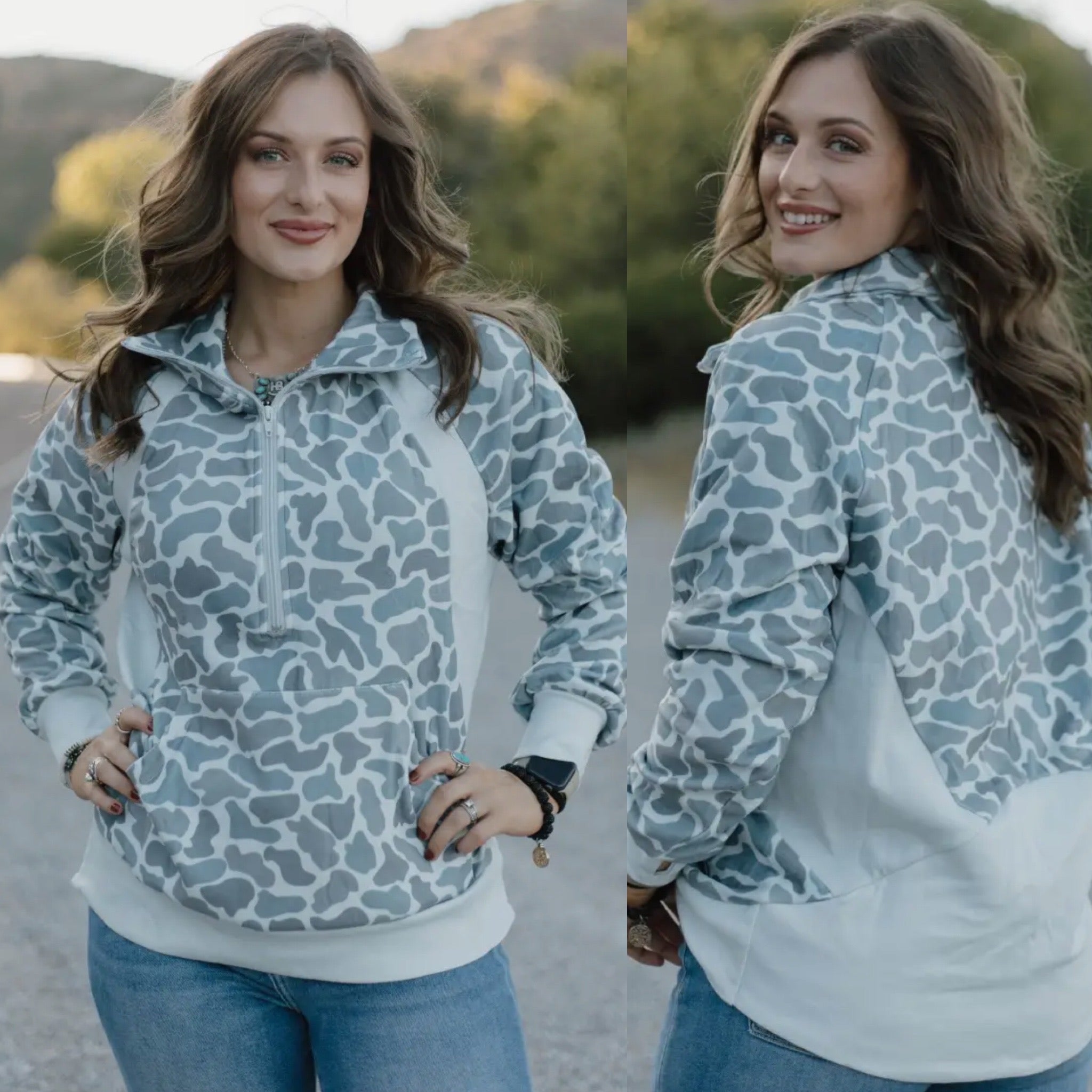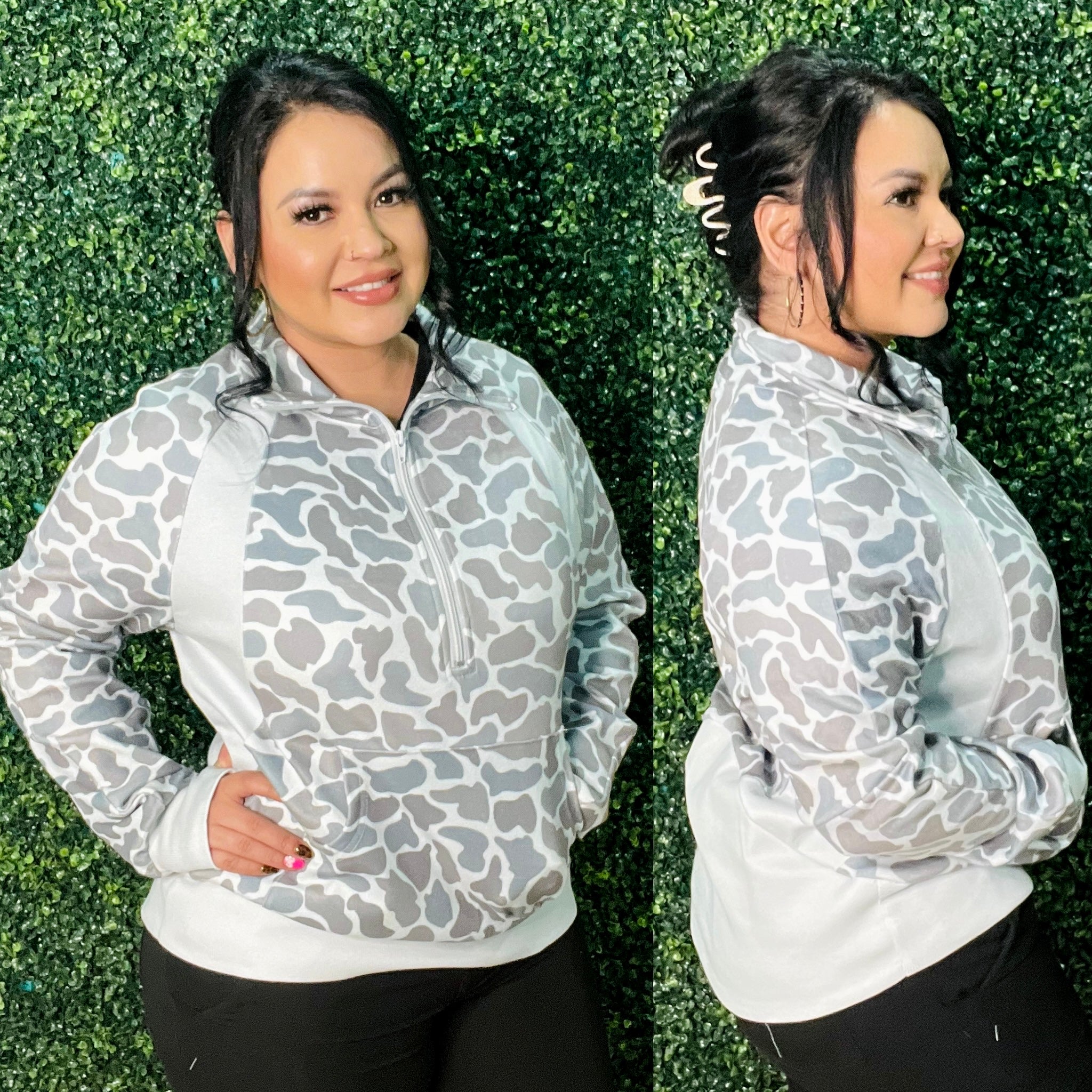 The Nothing In My Way Pullover blends style and comfort with its distinctive gray and cream camo design crafted from two different materials. This unique combination not only adds texture and visual interest but also ensures a versatile feel, perfect for layering or wearing on its own. Durable yet soft, it offers a comfortable fit that moves with you, making it an ideal choice for staying confident and comfortable no matter where your day takes you.
