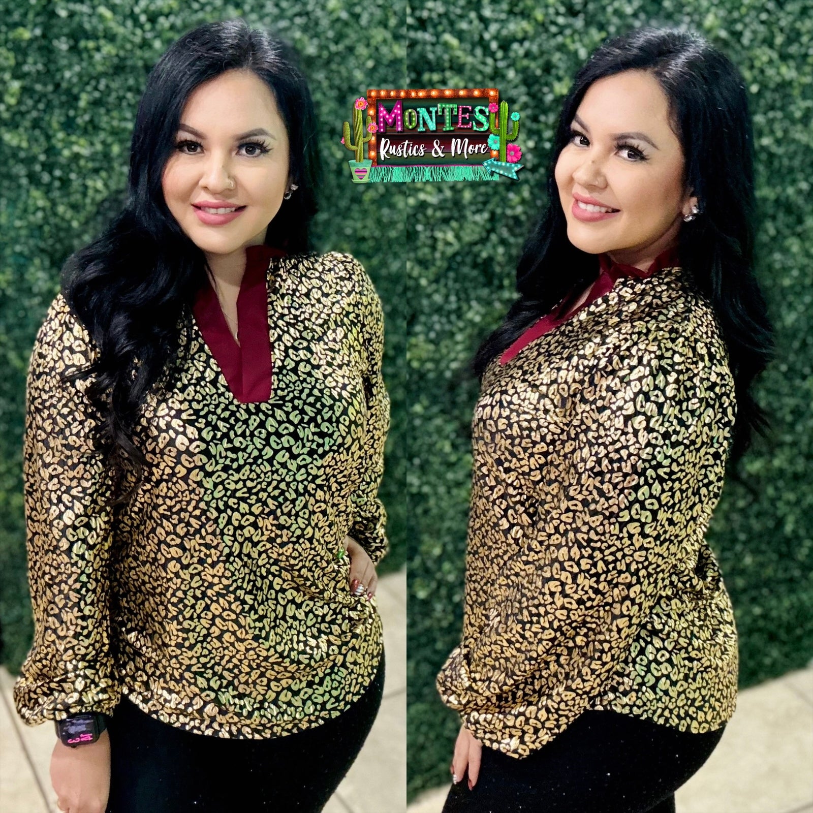FRILL HEM NOTCH NECK WITH CONTRAST BAND CHEETAH LEOPARD ANIMAL FOIL PRINT LONG SLEEVE BLOUSE TOP